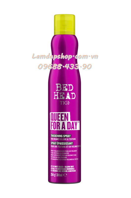 - Sắm ngay độ phồng lâu dài với Bed Head Queen for a Day! Loại xịt này cung cấp độ dày, cấu trúc và giữ nếp mềm mại cùng khả năng làm dày sợi tóc và phồng chân tóc đáng kinh ngạc. Tóc vẫn mềm, mượt nhưng vẻ ngoài phồng dày hơn!