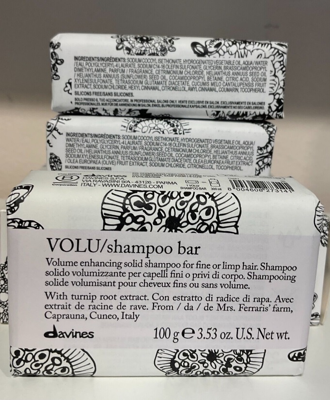 Bánh dầu gội Davines Volu Shampoo Bar với kết cấu dạng cứng, chuyển thành dạng kem đậm đặc khi tiếp xúc với nước, giúp làm sạch sâu cho tóc và da đầu. Mang tới độ mềm mại, tăng cường độ bóng và sự mềm mượt cho sợi tóc